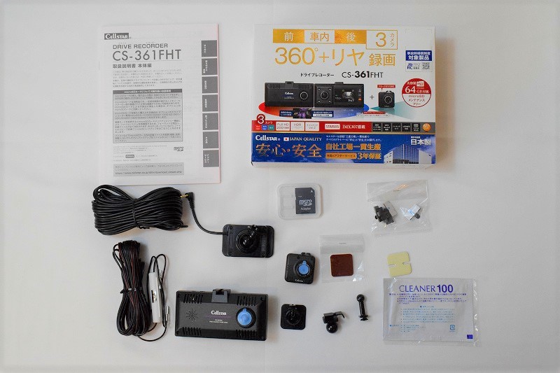 セルスターのCS-361FHTは、フロント筐体の前後に360°魚眼カメラを搭載し、さらにリアカメラを組み合わせた3カメラモデルです。