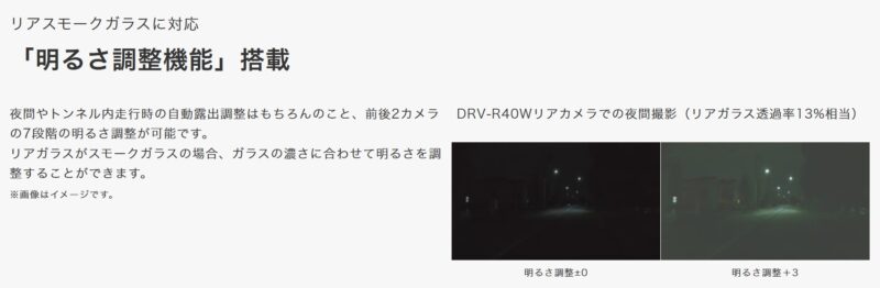 DRV-R40W のプロダクトページに掲載されている実写サンプルを見る限り、夜間映像は 最近のドラレコとしては暗め に見えます。 (ドラレコは明るい市街地では明るくて当たり前、微妙な明るさ、暗い場所では性能差が明確に出ます)