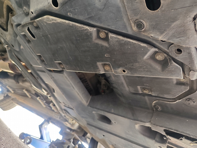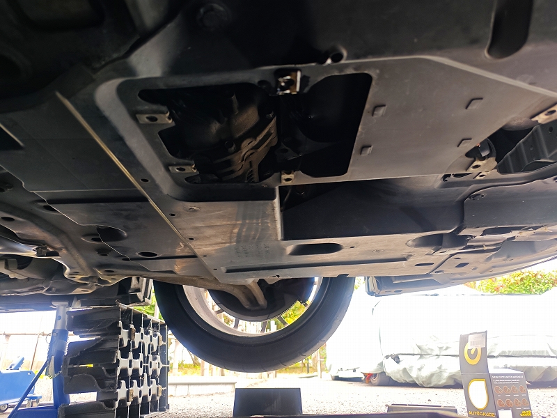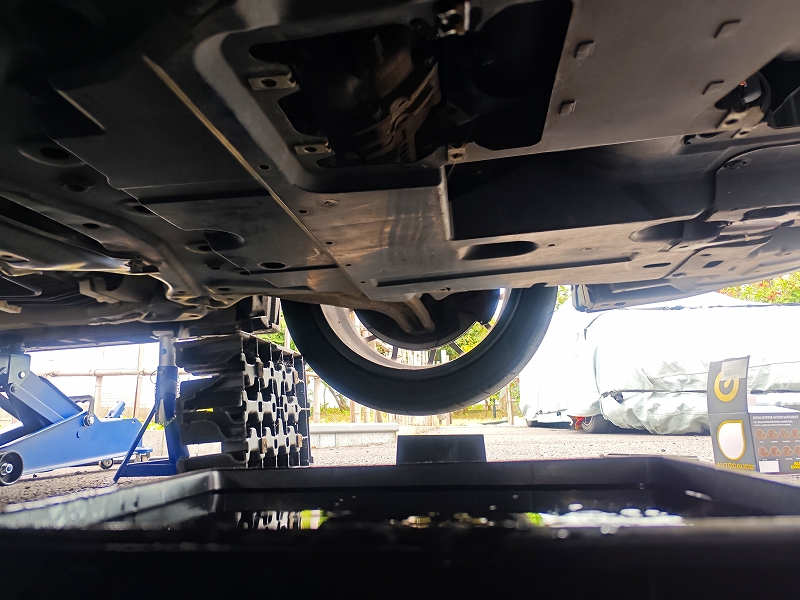 まずは前方をジャッキアップして馬掛けしてから、アンダーカバーを外します。