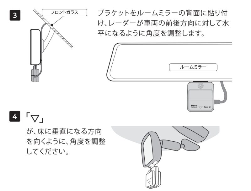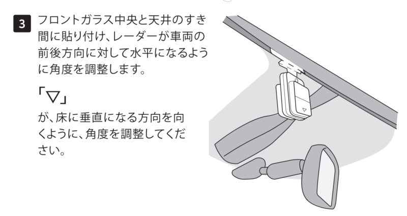 レーダーの取り付け位置は、ミニバン・SUV・コンパクトカーなどの一般的な車両を前提に説明書を作成しており、基本は「ルームミラー下」を推奨しています。