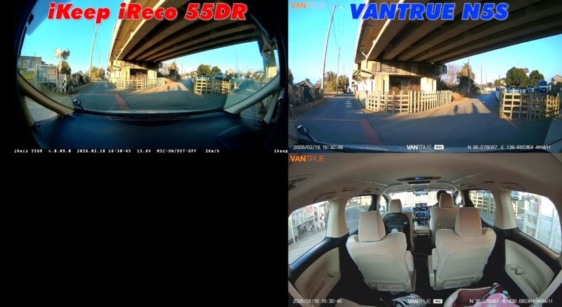 フロント360°のiRecoでは比較的奥まで映っている左右の車線が、N5Sではごく至近距離までしか映っていないことがお分かりいただけるかと思います。