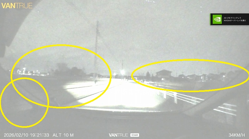 画面内の黄色の〇で囲った部分が、街灯の影響を受けて陰になっているのがお分かりいただけると思います。