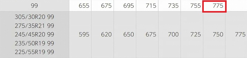 そのため、耐荷重表を使って純正と同じ荷重性能を得られる空気圧を求める必要があります。