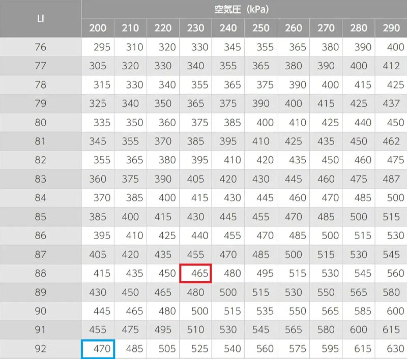 フロントタイヤを例に取って88のロードインデックスだけを見ると、純正では230kPaの空気圧では耐荷重465kg、ロードインデックスが92にになると470kgの耐荷重は200kPaとなります。