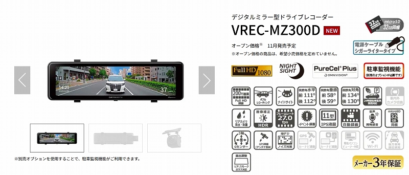 パイオニアから前後フルハイビジョンのスタンダードデジタルミラー「VREC-MZ300D」が発表されています。